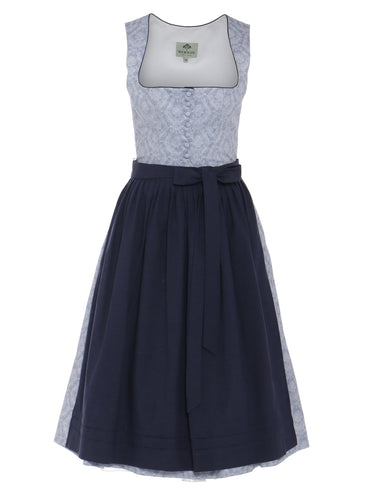 Unser geknöpftes Dirndl in klassischer Form ist ein zeitloses Stück für jeden Anlass. Das Baumwoll-Ornamentmuster verleiht dem Dirndl einen traditionellen Charme und eine frische Note. Feine Ausschnittpaspeln betonen den Ausschnitt auf elegante Weis, geknöpft wird dieses Dirndl mit stoffbezogenen Knöpfen. Die Schürze aus uni Baumwolle mit Wäschefalten bildet einen schönen Kontrast zum Druck des Dirndls. Der Rock ist in Falten gelegt und verfügt über seitliche Taschen für praktischen Stauraum. Mit einer Rocklänge von 75 cm ist dieses Dirndl ideal für festliche Anlässe oder traditionelle Feiern und wird sicherlich bewundernde Blicke auf sich ziehen.