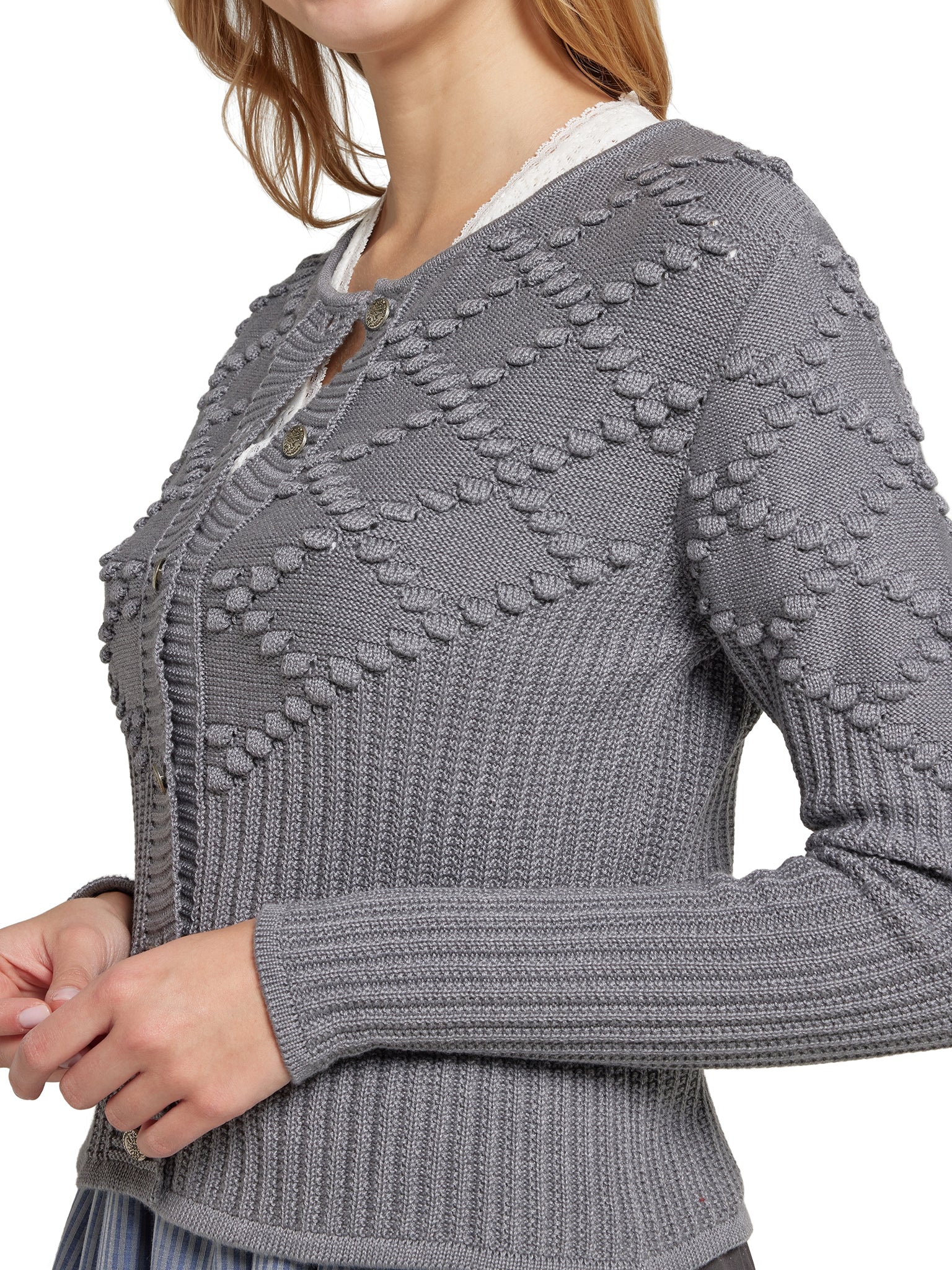 Stilvolle Wärme in aufwendiger Strickkunst: Diese hochgeschlossene Strickjacke ist das perfekte Pendant zu Ihrem Dirndl. Sie besticht durch ein kunstvolles Rautenmuster, in das kleine, charmante Bommeln eingestrickt sind – ein Detail, das der Jacke eine außergewöhnliche Textur und eine lebendige Optik verleiht. Die kurze, taillierte Schnittführung wurde gezielt so entworfen, dass sie exakt auf der Höhe des Mieders abschließt, um die feminine Silhouette zu betonen, ohne das Dirndl zu verdecken.
