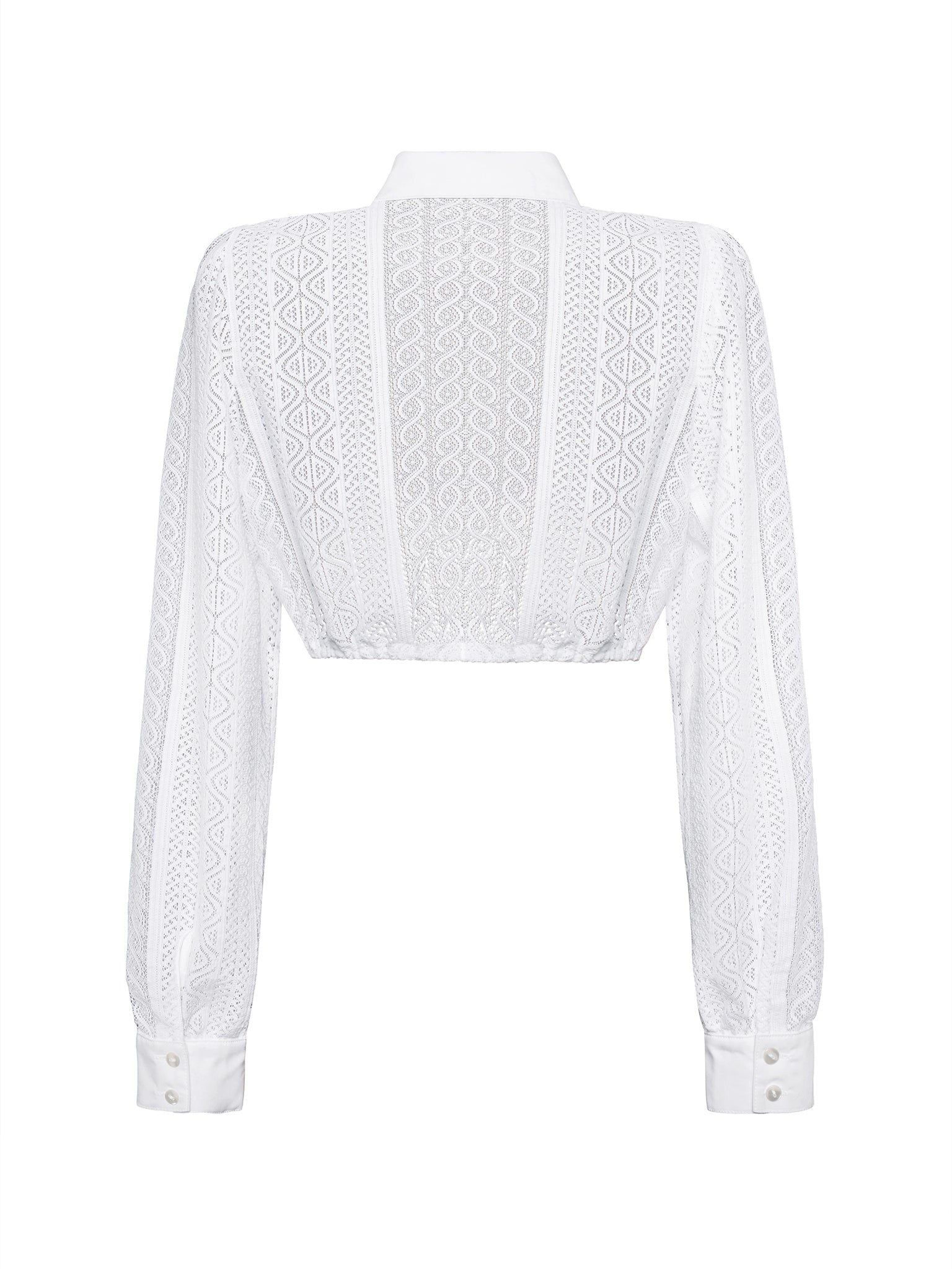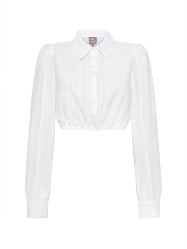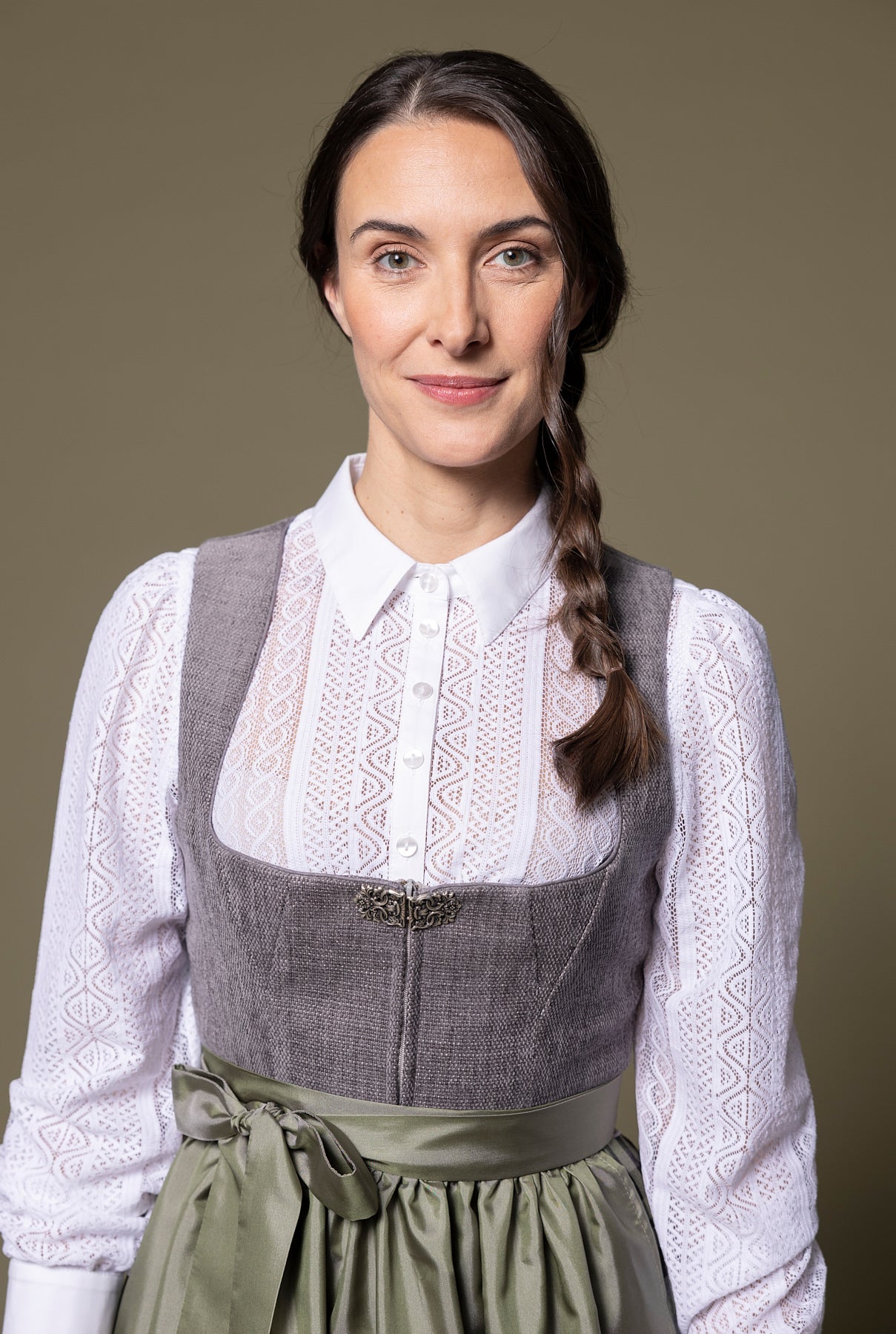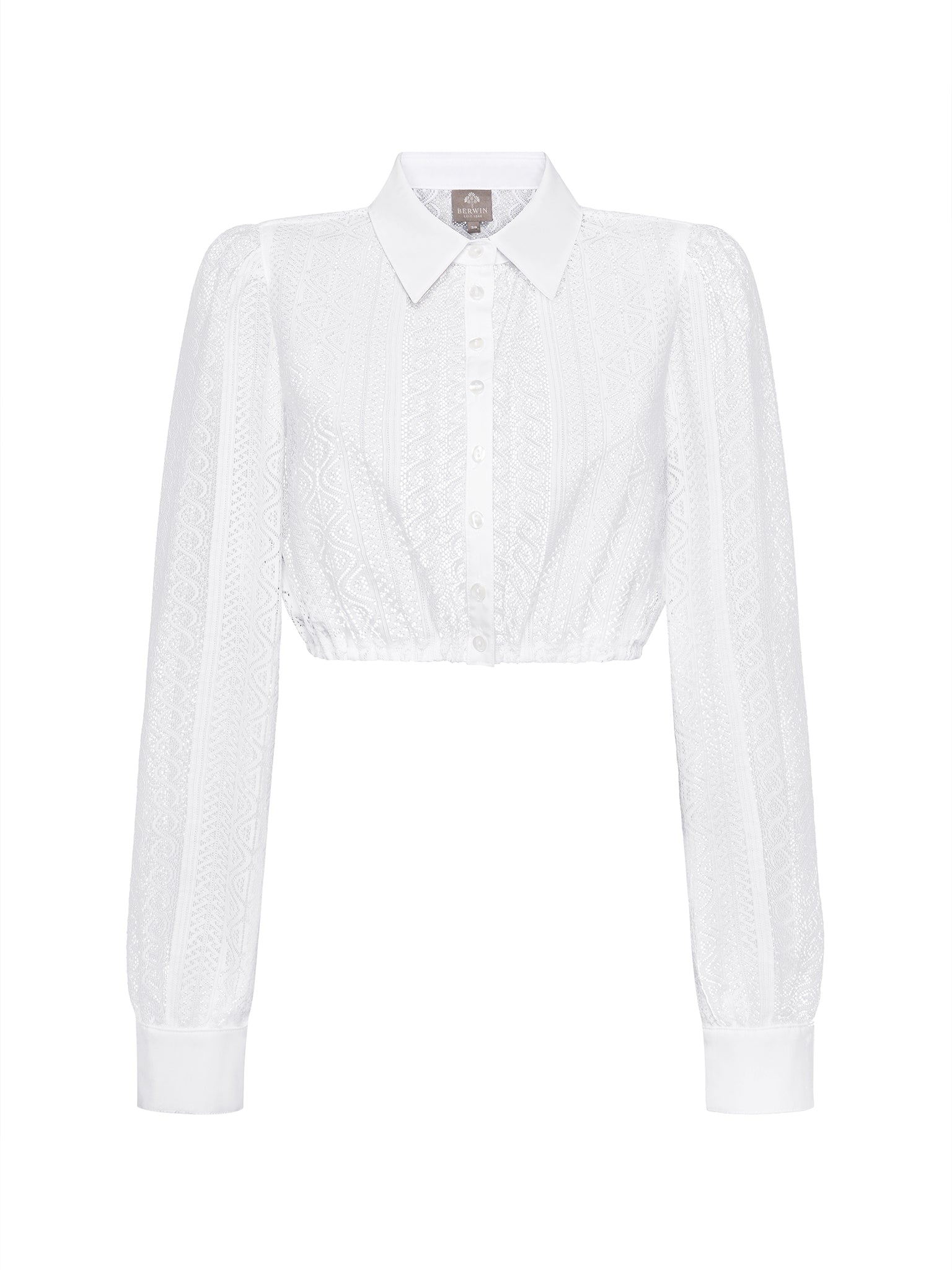 Diese elegante Spitzen-Dirndlbluse ist geknöpft und besticht mit einem kleinen Hemdkragen aus einfarbigem Stoff, der das Dekolleté betont. Der angereihte Langarm bietet angenehmen Tragekomfort und ist perfekt für kühlere Tage geeignet. Der lange Arm hat eine geknöpfte, einfarbige Manschette, was der Bluse einen raffinierten und femininen Touch verleiht. Diese Bluse ist ideal für festliche Anlässe und Trachtenveranstaltungen geeignet und harmoniert perfekt mit einem traditionellen Dirndl.