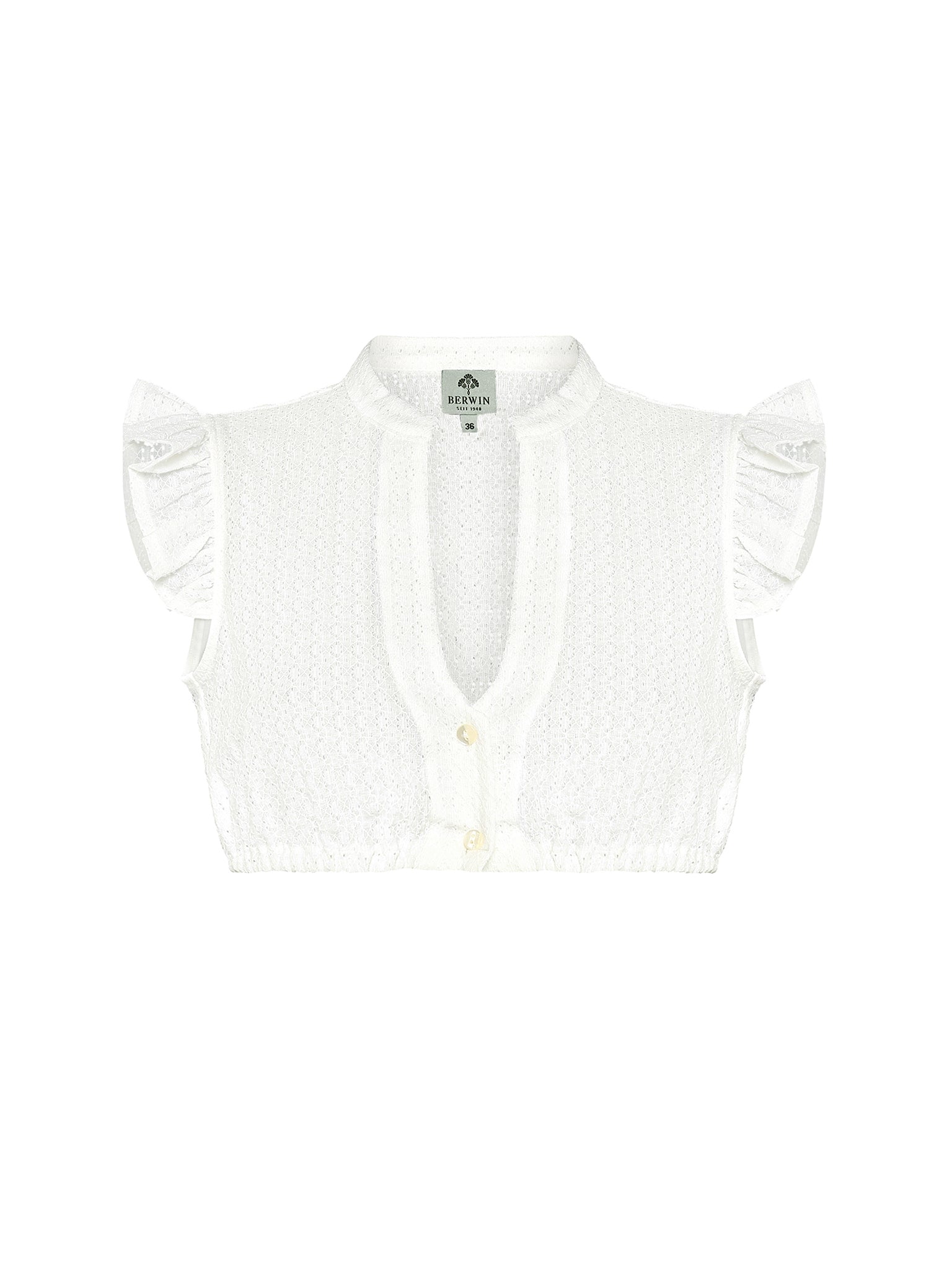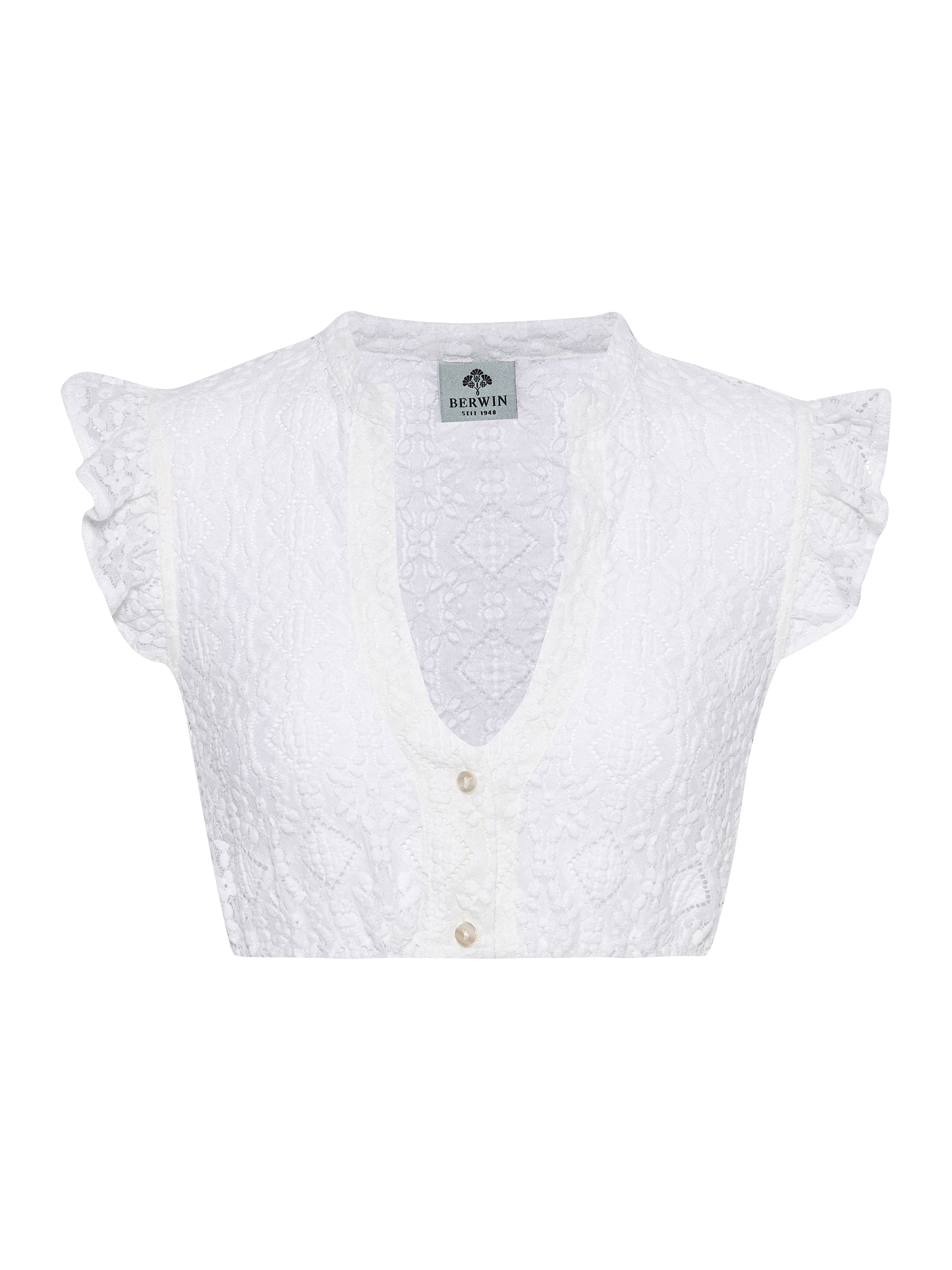 Die Kombination aus einem edlen Stehkragen und dem schmeichelhaften V-Ausschnitt sorgt für eine besonders ansprechende, feminine Linienführung. Ein charmantes Detail ist der sehr kurze Arm, der mit einem feinen Knopfverschluss versehen ist – dieses Element verleiht der Bluse eine subtile Verspieltheit und unterstreicht die hochwertige Verarbeitung. Ob für eine Hochzeit, ein Jubiläum oder andere festliche Anlässe: Diese Bluse ist die perfekte Wahl, um Ihrem Dirndl eine zeitlose und zugleich moderne Eleganz zu verleihen.
