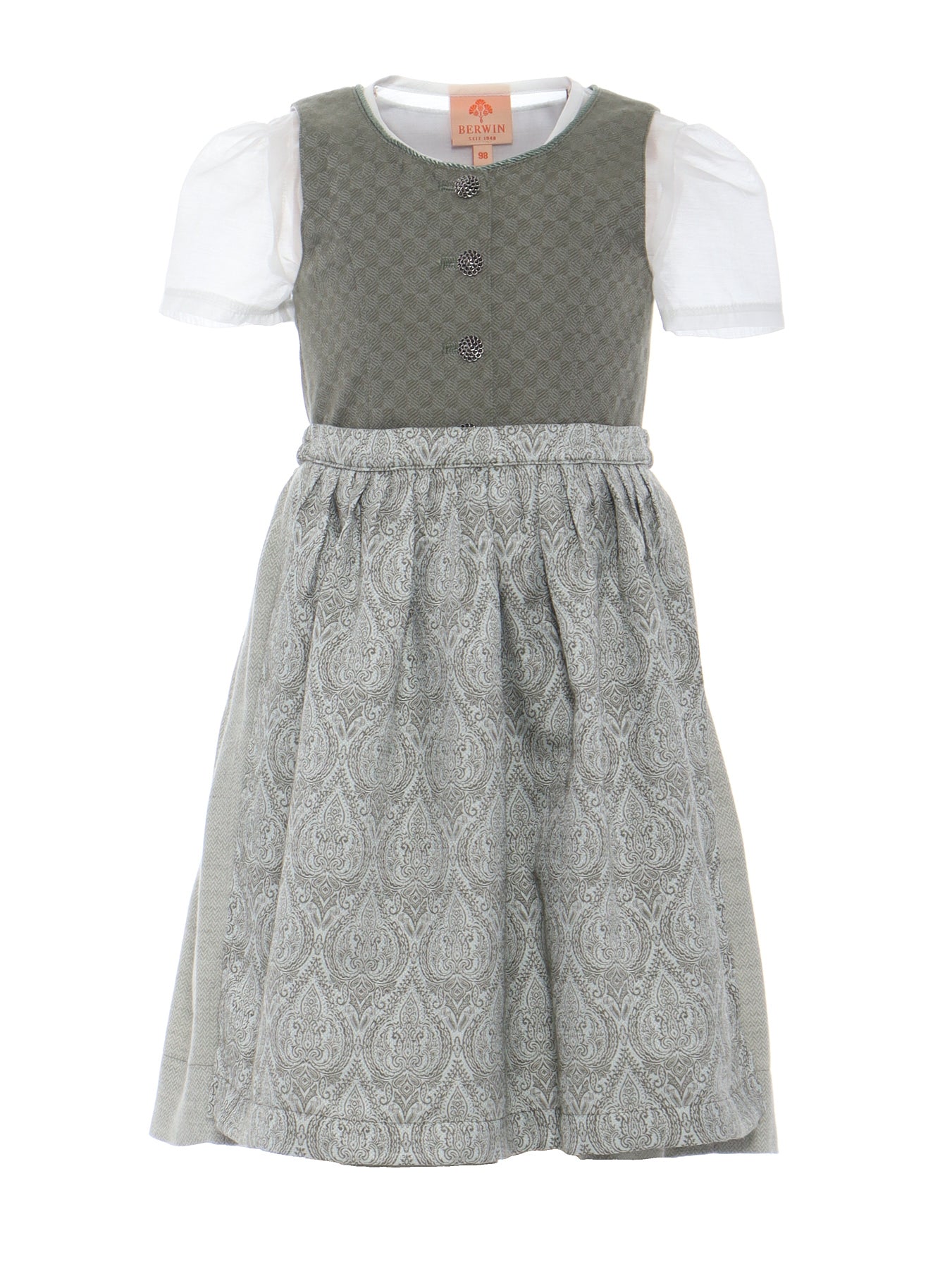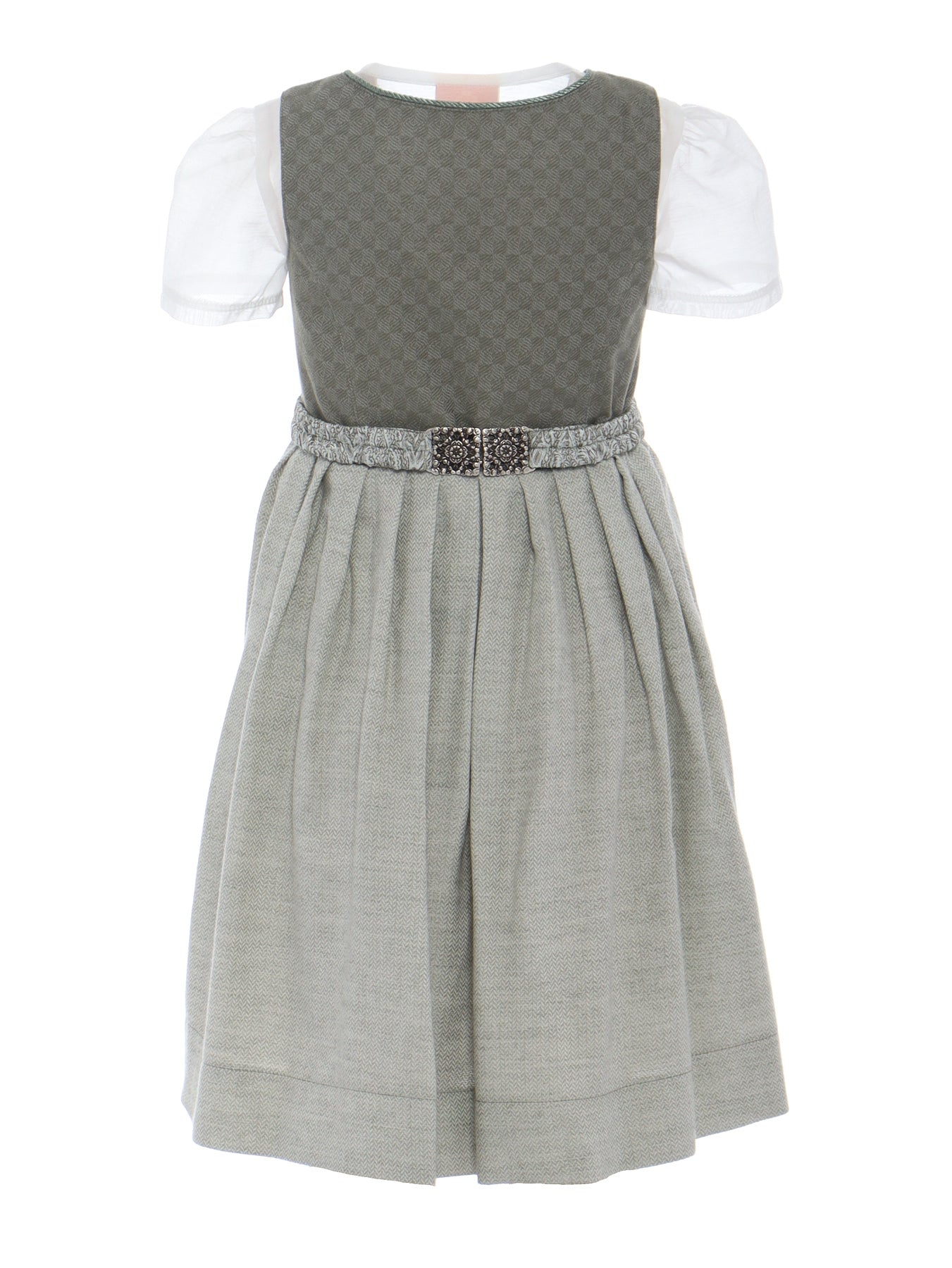 Das Dirndl ist mit einer Paspel im Ausschnitt verziert, die dem Design eine subtile Raffinesse verleiht. Der Rock ist in Falten gelegt und sorgt für eine schöne, schwingende Form, die das Dirndl besonders anmutig macht. Das Dirndl wird inklusive einer passenden Dirndlbluse geliefert, die das Outfit perfekt ergänzt und dem Kind einen bezaubernden Look verleiht.