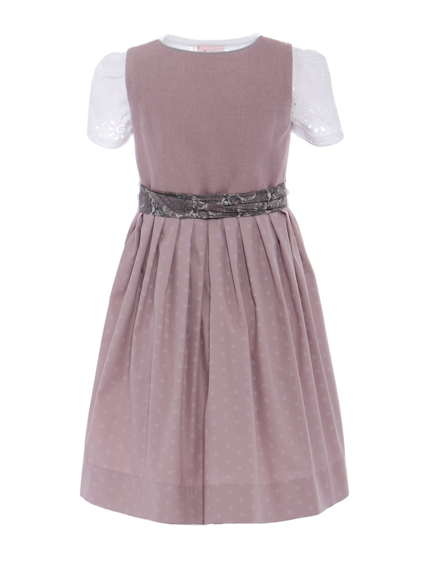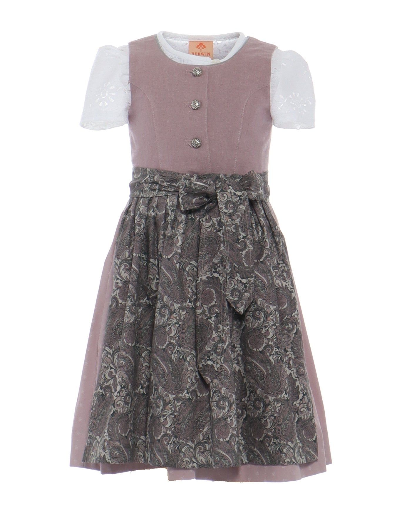 Dieses wunderschöne Kinderdirndl umfasst ein Oberteil aus reinem Leinen, das für eine leichte und angenehme Passform sorgt und gleichzeitig eine edle Optik bietet. Der runde Ausschnitt wird mit hochwertigen, silberfarbenen Knöpfen verziert, die das klassische Design des Dirndls unterstreichen.