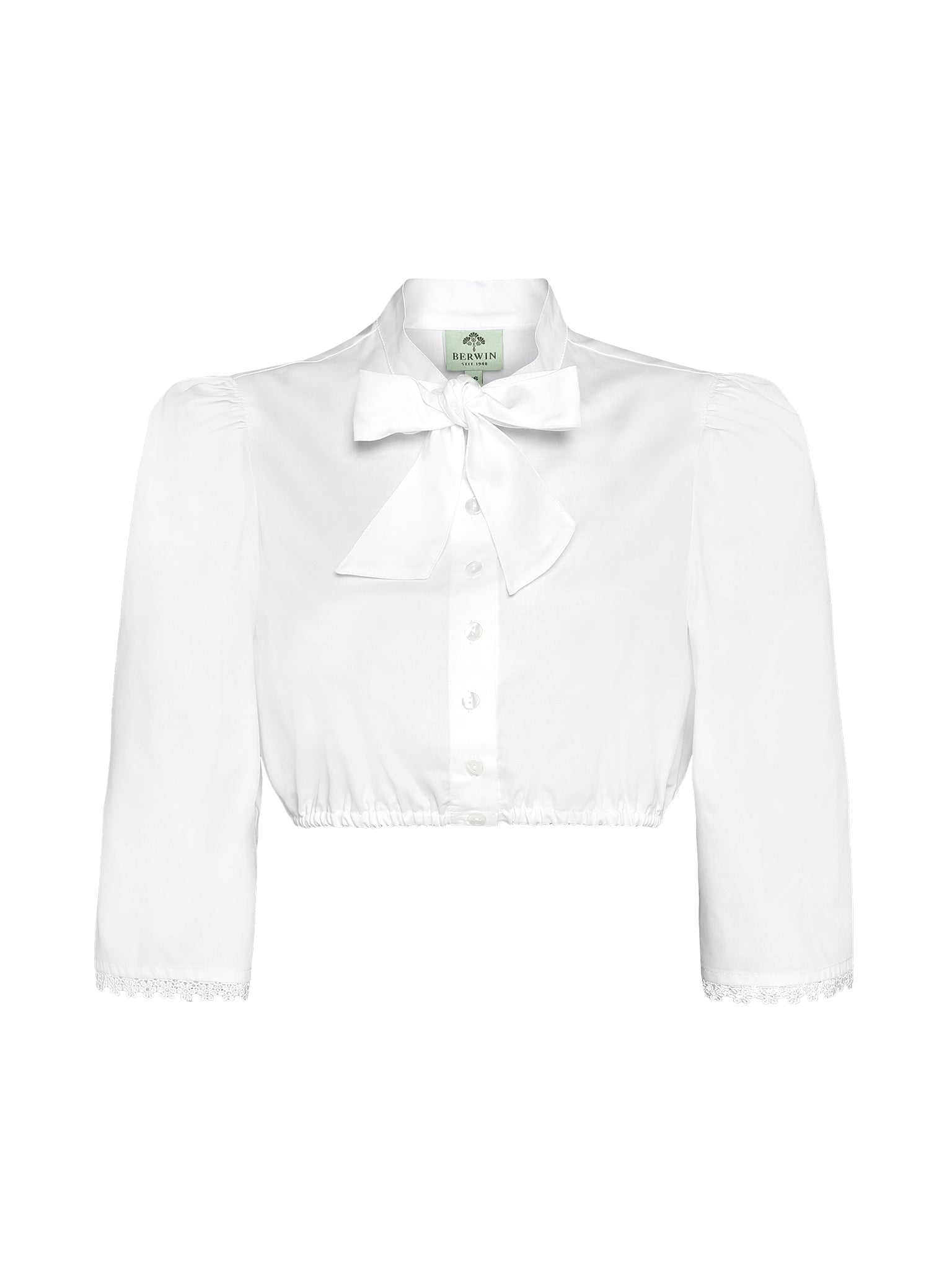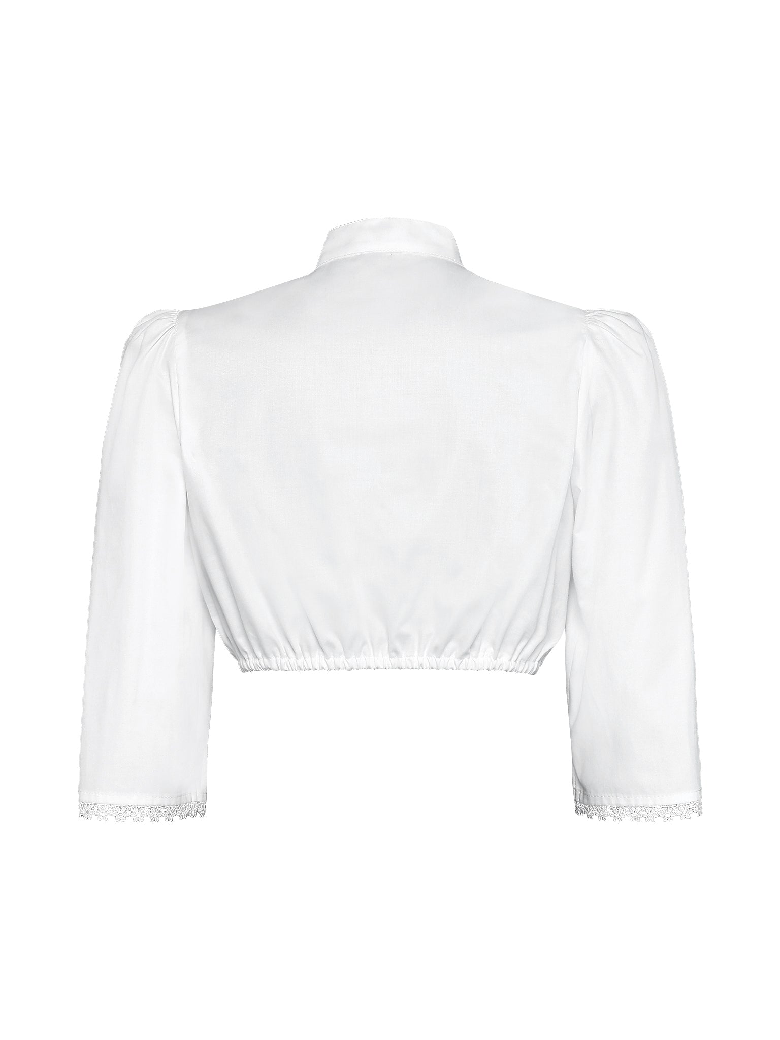 Elegante Dirndlbluse mit Stehkragen & Schluppe aus Baumwoll-Satin – 3/4-Arm mit Spitze