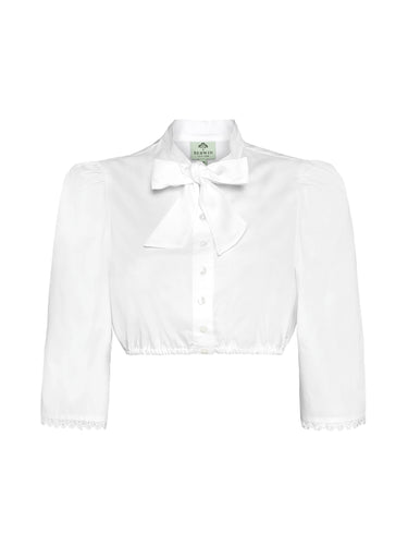 Diese elegante Dirndlbluse aus edlem Baumwoll-Satin vereint klassische Raffinesse mit zeitlosem Stil. Der feine Glanz des Stoffes verleiht der Bluse eine luxuriöse Optik, während der klassische Stehkragen und die dekorative Schluppe zum Binden den Look besonders feminin abrunden.