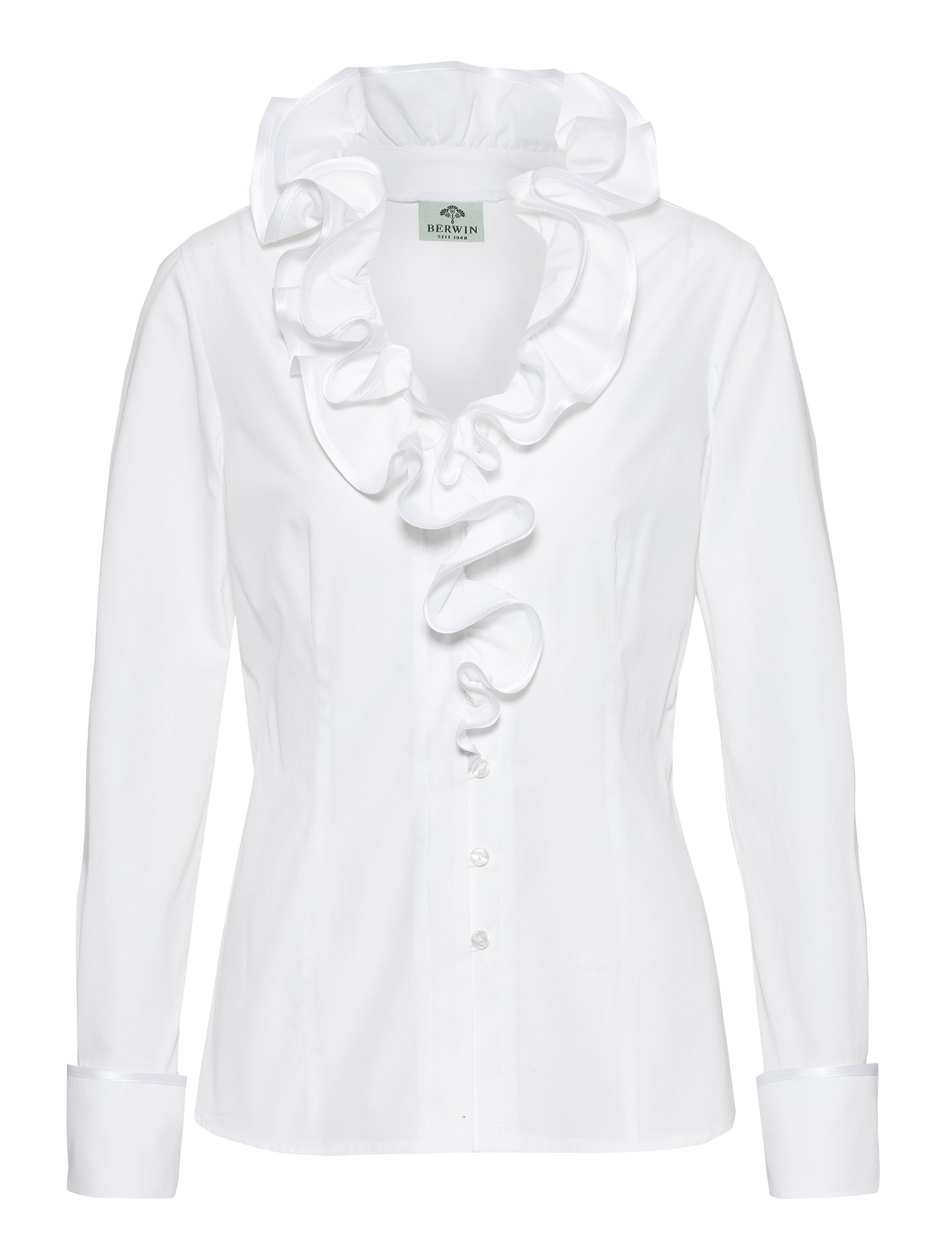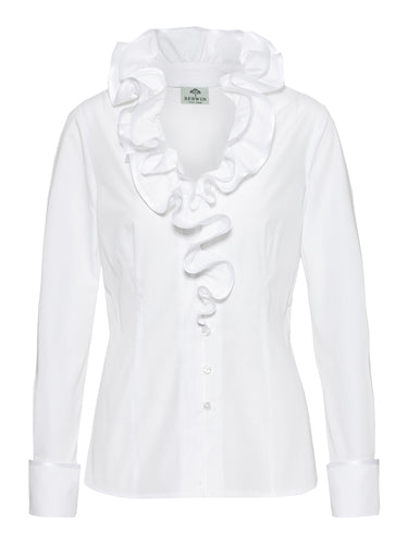 Handwerkliche Perfektion in ihrer schönsten Form: Diese Trachtenbluse besticht durch eine Fülle an raffinierten Details, die sie zu einem exklusiven Begleiter für anspruchsvolle Trachten-Looks machen. Die feminine Rüsche, die sich elegant am Vorderteil entlang und um den Hals schmiegt, ist mit einem feinen Satinband eingefasst. Dieser dezente Glanz setzt edle Akzente und unterstreicht die hochwertige Optik.