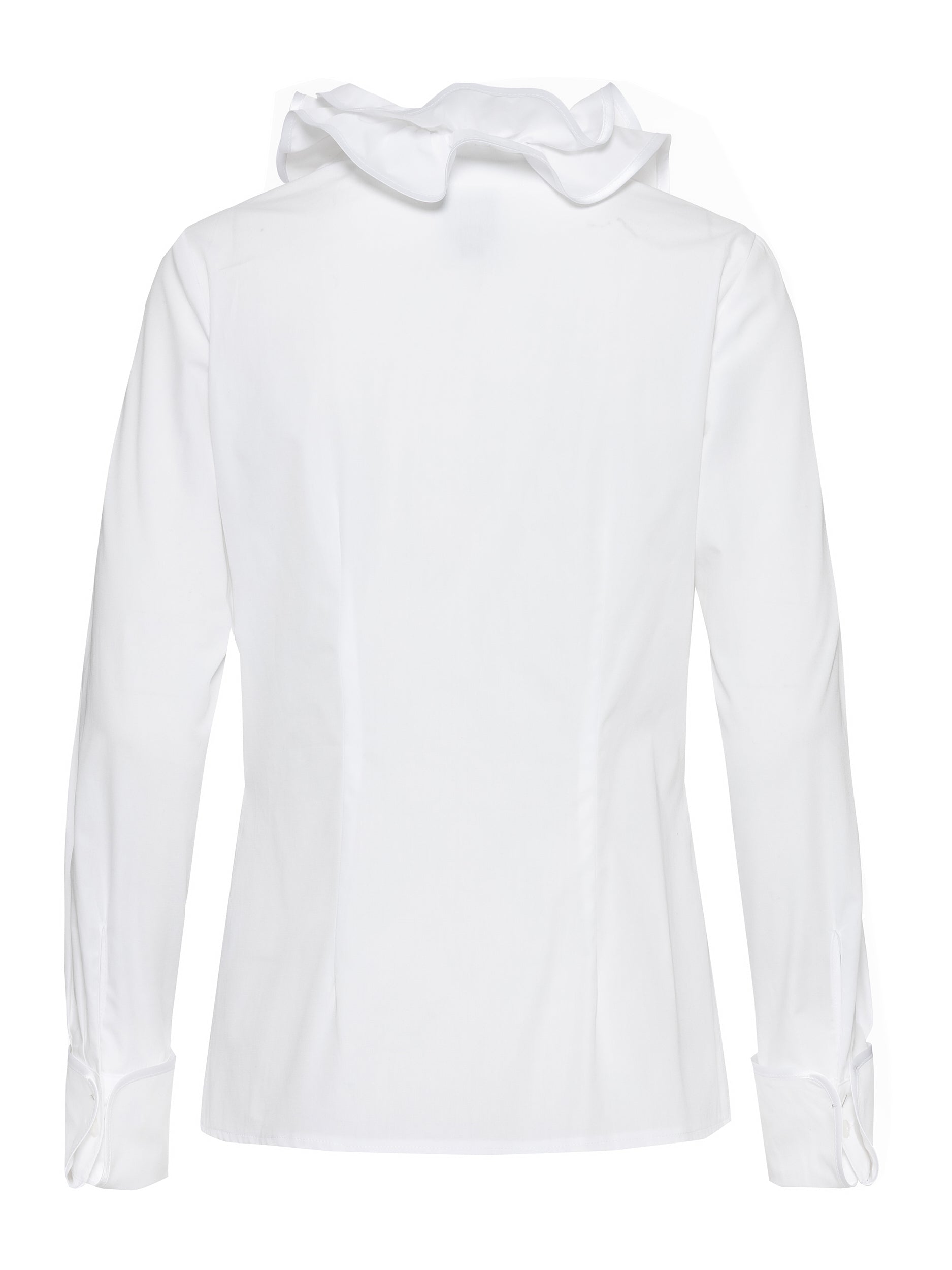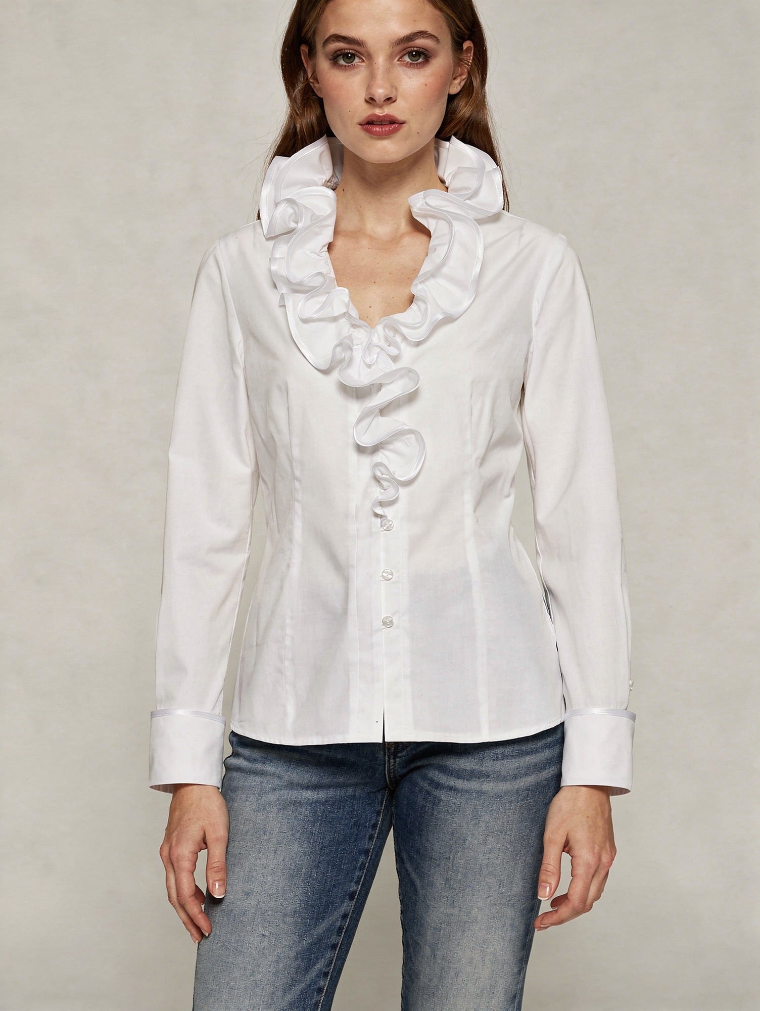 Ein besonderes Zeugnis meisterhafter Verarbeitung ist die teilweise verdeckte Knopfleiste, die mit handwerklich aufwendigen Schlingen verschlossen wird – ein Detail, das heute nur noch selten zu finden ist. Die doppelten Manschetten, ebenfalls mit Satinband veredelt, runden das luxuriöse Erscheinungsbild ab. In ihrer klassischen Passform bietet die Bluse einen perfekten Sitz und lässt sich wunderbar unter Miedern oder solo zum Rock kombinieren.