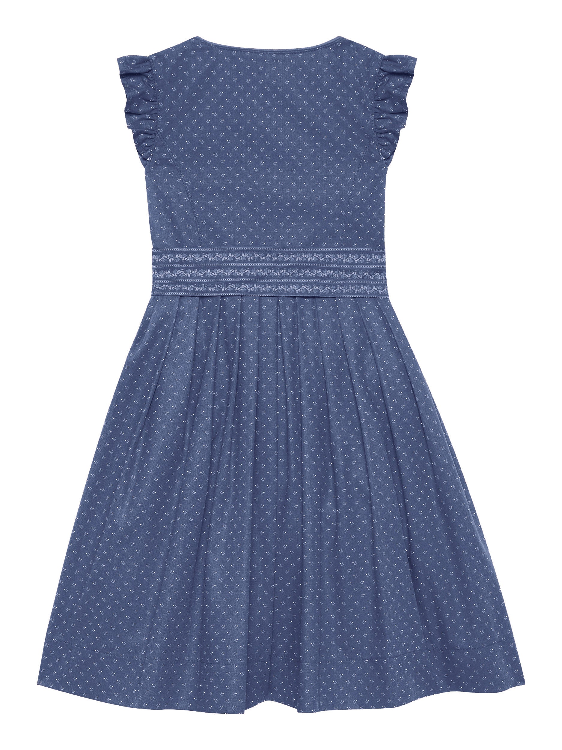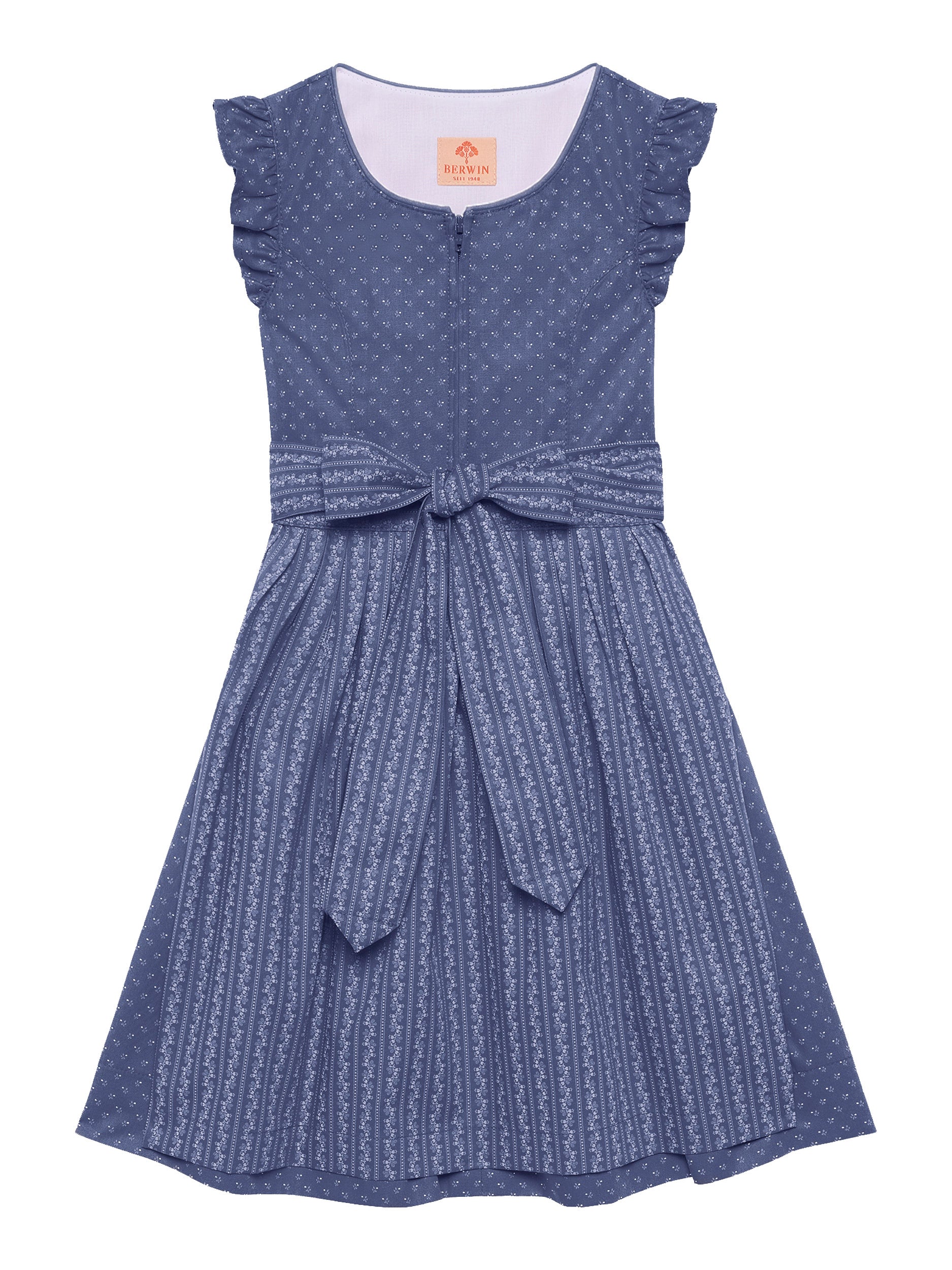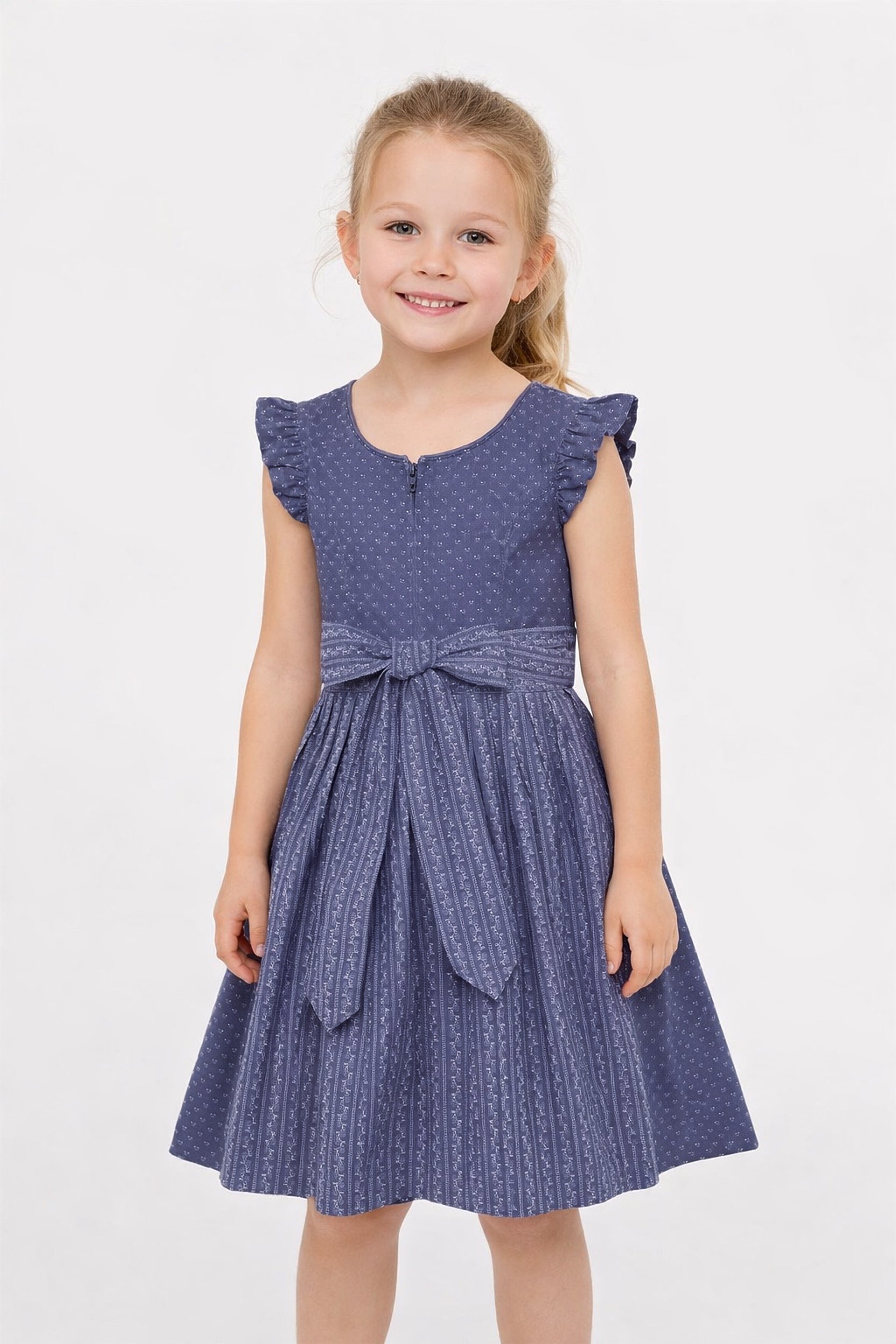 Dieses liebevoll gestaltete Kinderdirndl vereint traditionelle Elemente mit kindgerechtem Komfort. Gefertigt aus hochwertigem Blaudruck-Blümchenstoff, begeistert es mit einem Reißverschluss vorne und einem eleganten Paspel im Ausschnitt. Die süßen Flügelärmel sorgen für Bewegungsfreiheit und einen verspielten Look. Die kontrastierende Baumwoll-Schürze im Streifenmuster ergänzt das Design harmonisch. Der in Falten gelegte Rock bietet angenehme Weite – perfekt zum Spielen und Feiern. Ein wunderbares Dirndl für kleine Trachtenliebhaberinnen!