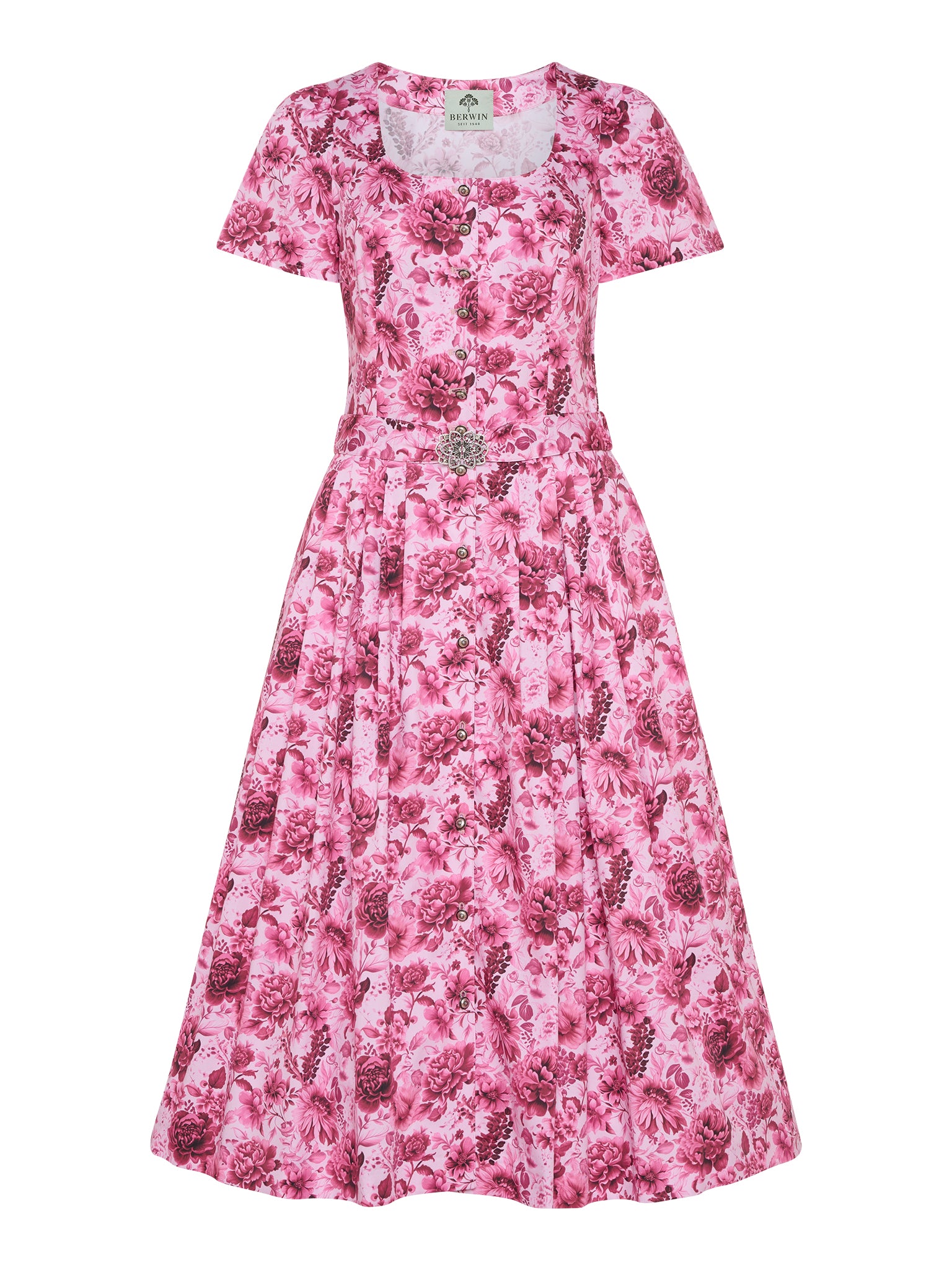 Dieses superleichte Sommerkleid aus Baumwoll-Satindruck ist perfekt für warme Tage. Es verfügt über einen kurzen, angereihten Arm und ist mit hochwertigen Knöpfen versehen. Der Rock ist in Falten gelegt und bietet mit seinen seitlichen Taschen zusätzlichen Komfort und praktische Funktionalität. Ein passender Gürtel mit einer silberfarbenen Schließe setzt einen eleganten Akzent und betont die Taille. Das Kleid wird ungefüttert geliefert. Mit einer Rocklänge von 75 cm ist es ideal für entspannte Sommertage und festliche Anlässe.