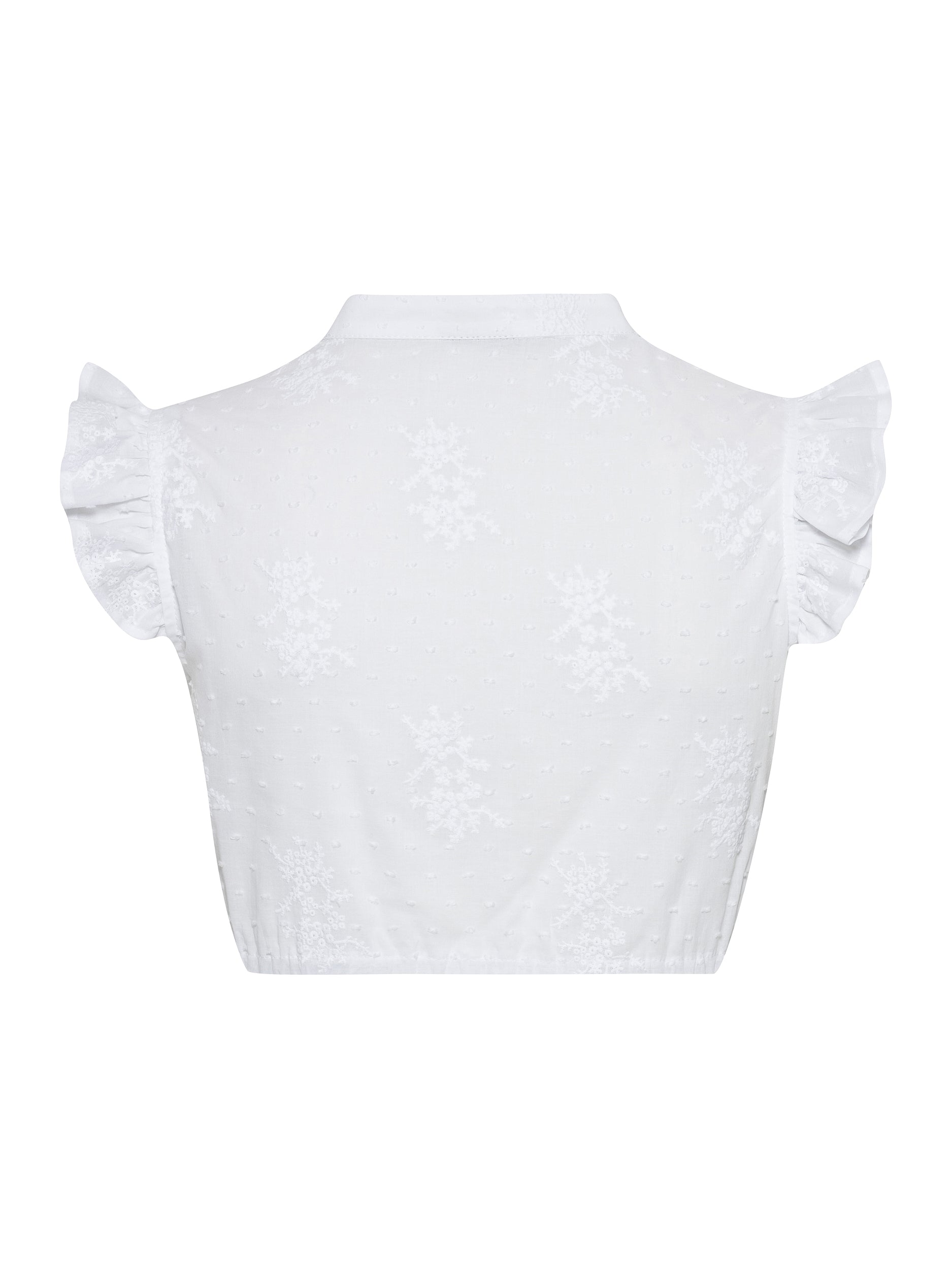 Der elegante Stehkragen rahmt das Gesicht stilvoll ein und sorgt für eine vornehme Ausstrahlung, während der sehr kurze Arm für eine moderne Leichtigkeit sorgt und an warmen Festtagen für angenehme Belüftung sorgt. Diese Bluse ist die ideale Wahl für Dirndl mit klassischem Ausschnitt oder hochgeschlossene Mieder. Die aufwendige Allover-Bestickung macht sie zu einem echten Schmuckstück, das Tradition und modernes Design meisterhaft vereint.