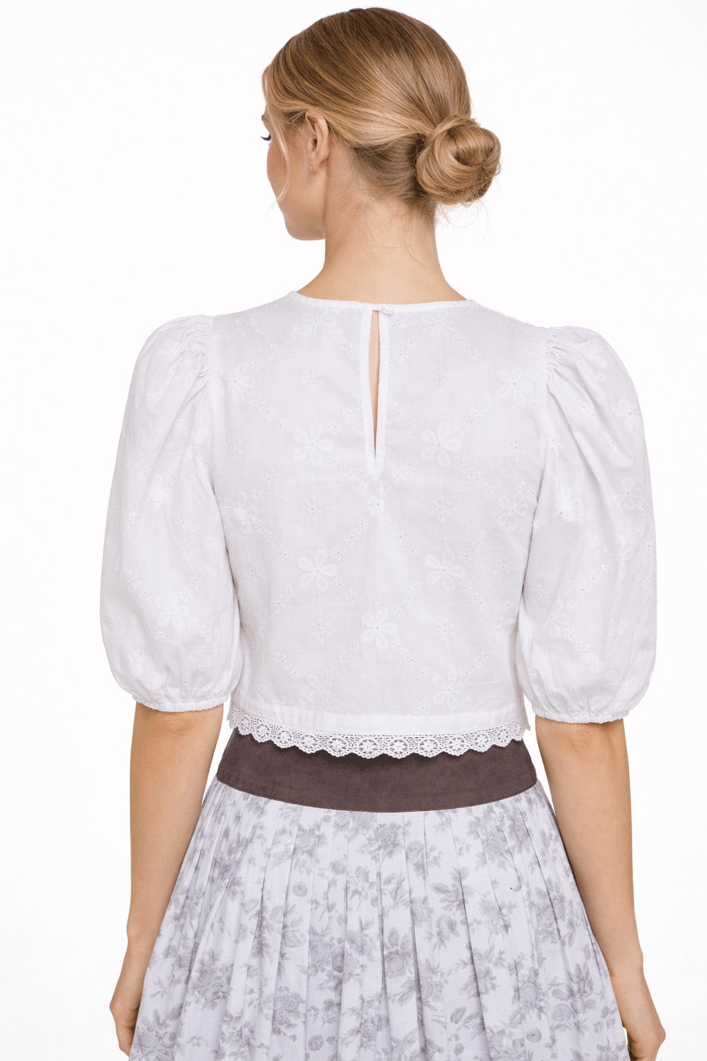 Am Saum ist eine wertvolle Spitze aufgenäht, die der Bluse eine feminine, elegante Note verleiht und sie perfekt für klassische Trachtenlooks oder festliche Anlässe macht. Durch das harmonische Zusammenspiel von feiner Stickerei, hochwertigen Materialien und liebevoll gestalteten Details entsteht ein Kleidungsstück, das sowohl stilvoll als auch bequem ist und vielseitig kombiniert werden kann.