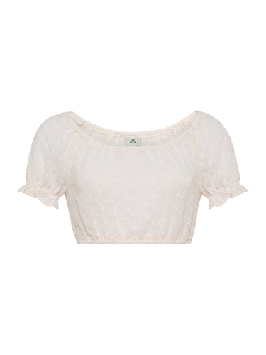 Sommerliche, leichte Dirndlbluse aus zart besticktem Organzastoff, die mit einem komfortablen Gummizug im Ausschnitt für perfekten Sitz sorgt. Die sehr kurzen Ärmel sind ebenfalls mit einem Gummizugabschluss versehen und verleihen dem Modell eine verspielte, luftige Optik. In bequemer Schlupfform und ungefüttert – ideal für warme Tage und traditionelle Outfits mit Leichtigkeit.
