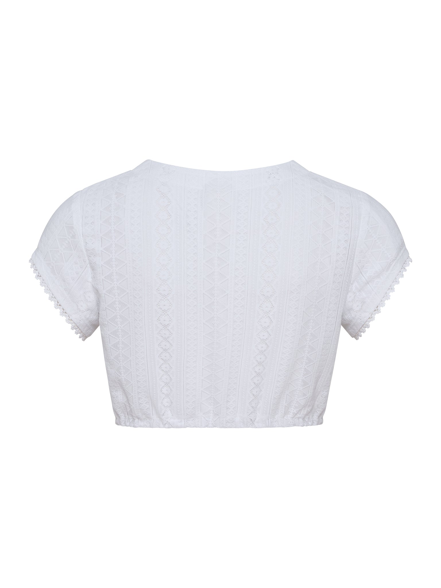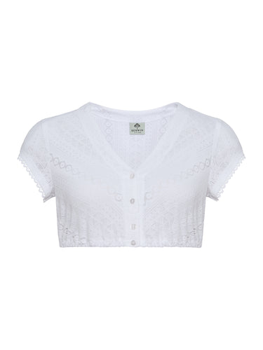 Die Dirndlbluse besteht komplett aus feinem Streifen-Spitzenstoff, der durch diagonal verlaufende Verarbeitung eine besondere, spannende Optik erzeugt. Die kurzen Ärmel sind mit einer zarten Abschluss-Spitze versehen, die dem Modell einen eleganten und femininen Touch verleiht. Ein hochwertiges, leichtes Stück, das traditionellen Charme mit modischem Flair verbindet.
