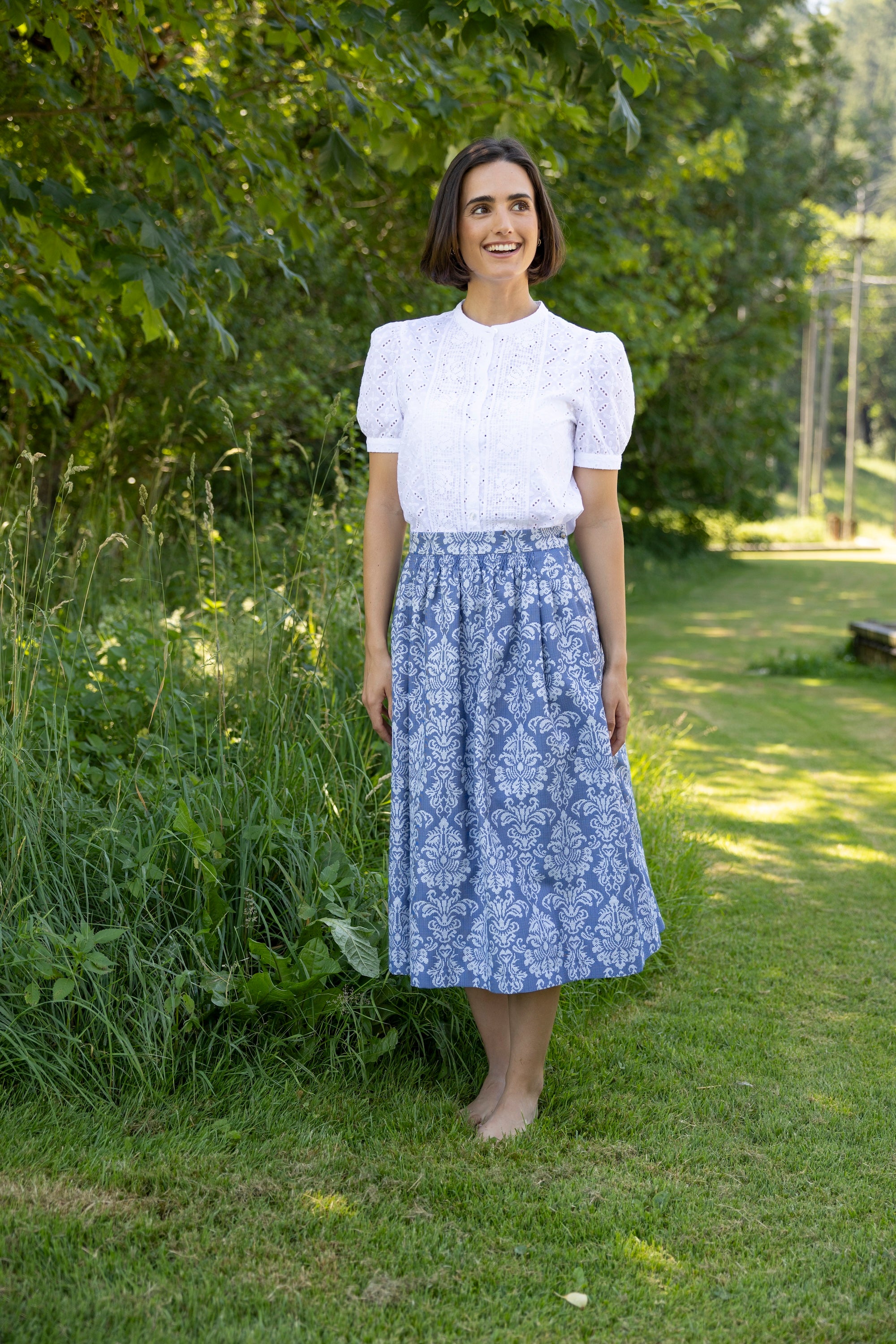 Diese sommerliche Stehkragenbluse besticht durch ihren hochwertigen, bestickten Baumwollstoff und eine feminine, leicht taillierte Silhouette. Der angereihte Halbarm mit eleganter Manschette sorgt für einen komfortablen Sitz, während die durchgehende Knopfleiste das An- und Ausziehen erleichtert. Besonders charmant ist die aufgesetzte Klöppelspitze vorne, die der Bluse eine edle, verspielte Note verleiht. Perfekt kombinierbar zu Röcken und Hosen – für einen stilvollen Auftritt an warmen Tagen.